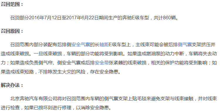 以上是2018年5月25日,北京奔馳汽車公司有限公司,因汽車主線束破損而召回汽車的一系列新聞。其中原因是”汽車線束破損,車輛的部分功能受到影響。如果造成燃油泵的動(dòng)力中斷,車輛將失去動(dòng)力;如果造成負(fù)責(zé)側(cè)氣簾、側(cè)安全氣囊或后排安全帶張緊器的線束破損,相關(guān)的保護(hù)功能將受到影響;如果造成線束短路,不排除發(fā)生火災(zāi)的風(fēng)險(xiǎn),存在安全隱患”。因此,我們應(yīng)該注意預(yù)防和防范。